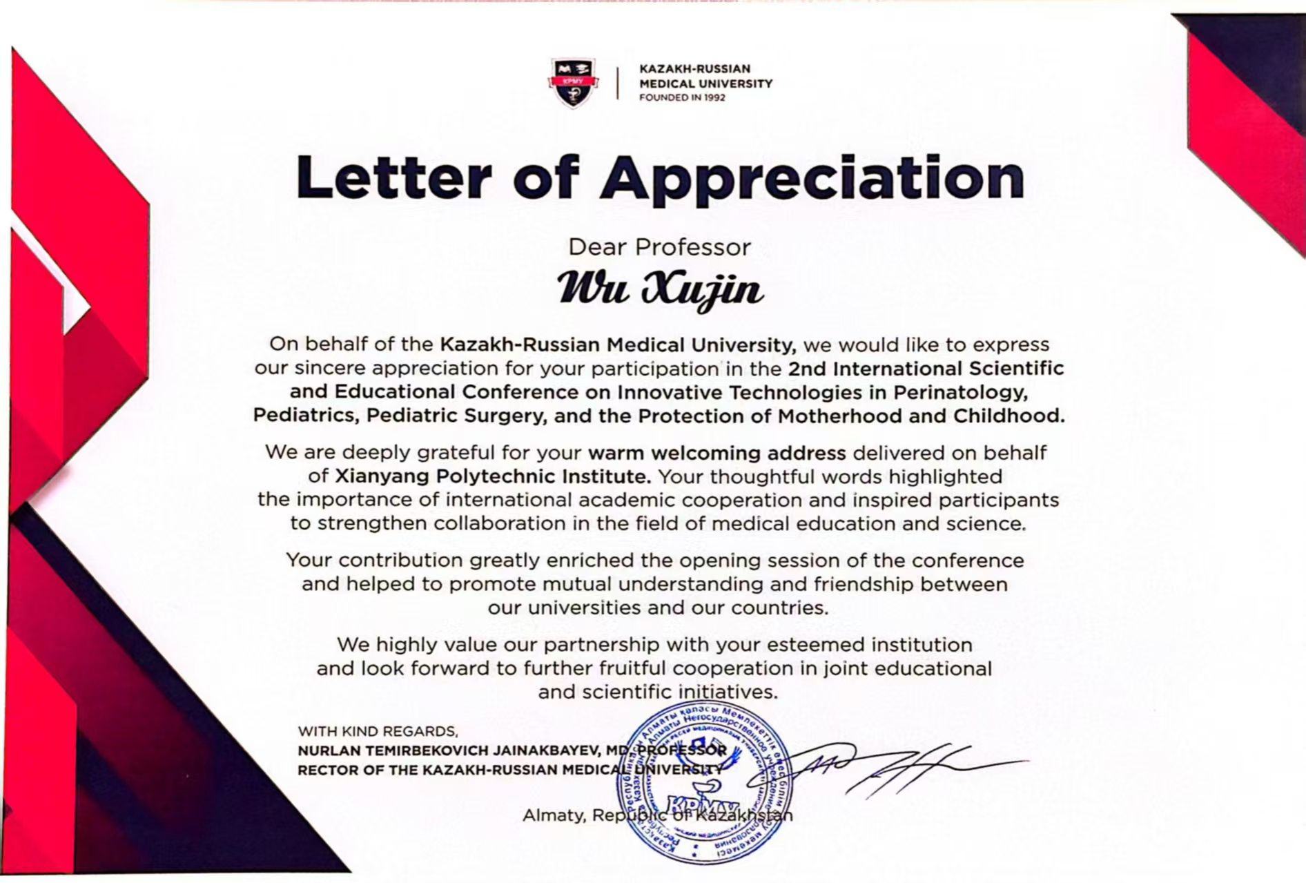 Xianyang Polytechnic Institute (XYPI) has recently received appreciation letters from the Kazakh-Russian Medical University (KRMU) in recognition of its engagement in the 2nd International Scientific and Educational Conference on Innovative Technologies in Perinatology, Pediatrics, Pediatric Surgery, and the Protection of Motherhood and Childhood, hosted by KRMU.