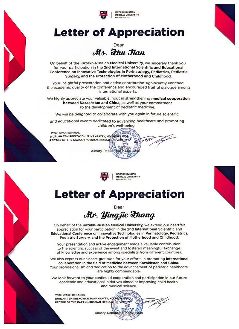 After the conference, Nurlan Temirbekovich Jainakbayev, rector of KRMU, personally signed the appreciation letters to extend sincere gratitude. The correspondence noted that Professor Wu’s address reflected XYPI’s high regard for the event, injecting momentum into deeper institutional collaboration and Sino-Kazakh medical ties. The presentations by Dr. Zhu and Dr. Zhang were praised for fostering knowledge exchange among international experts, highlighting that their efforts to boost Sino-Kazakh medical cooperation and pediatric healthcare progress “are highly commendable.”